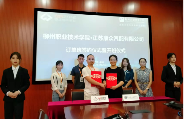 新闻网消息(文、图/汽车工程学院  范利红)2022年6月24日,汽车工程学院与江苏康众汽配有限公司“供应链”订单班签约暨开班仪式在T1-D201举行。汽车工程学院院长吴星、办公室主任张迎凤,江苏康众汽配有限公司B2B运营部人事行政经理隋鑫、广西区域经理欧阳毅、广西区域人事经理黄少凤,订单班全体同学出席仪式。