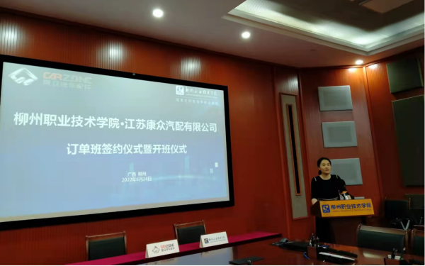 隋鑫在致辞中表示,非常感谢柳州职业技术学院能大力促进双方的这次合作,能让新康众在推进产教融合、学校专业建设、老师教材教法、学生的就业创业等方面做出贡献。期待新康众和柳职在后续合作中能紧扣行业发展趋势,不断完善协同育人机制,培养出更多汽后市场高素质高技能人才,期待本届订单班同学们学有所获,学有所成!