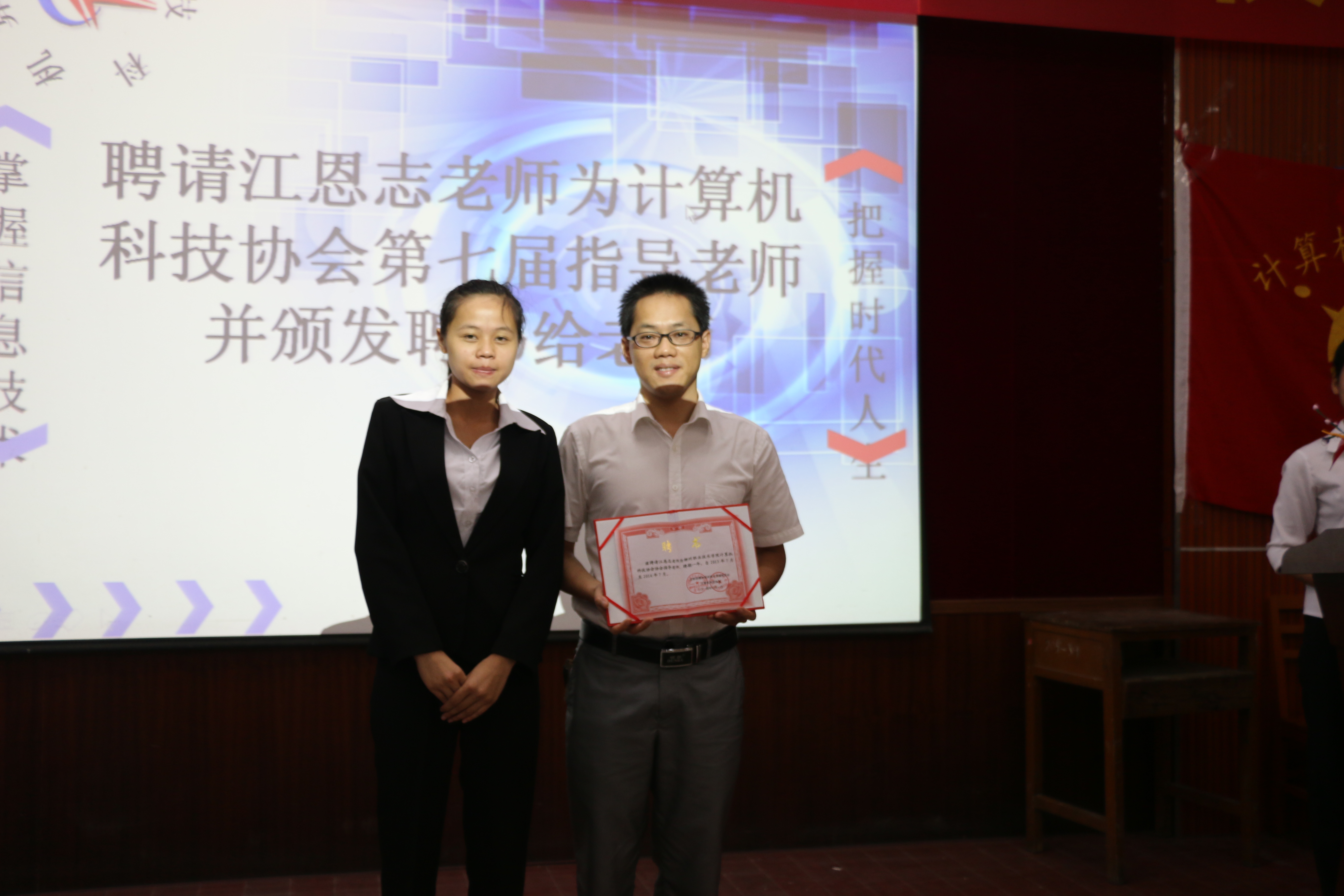 第六届会长唐瀚感谢大家对协会各项工作的支持,指出了上一年度中存在的不足,给新一届理事提出了宝贵的工作经验,同时聘请了江恩志、张德平老师为计算机科技协会第七届指导老师并颁发聘书给老师。随后黎老师和指导老师共同给2012级理事颁发协会理事聘书。