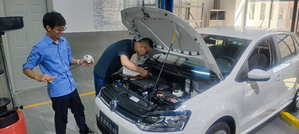 开班典礼之后,新教师开始持续10天的新教师基础技能培训。针对汽车类专业教师,学院精心准备了汽车基础技能培训,包括:汽车保养、汽车电气基础、汽车底盘拆装和发动机拆装等四大板块的内容,分别由四位资质深厚的老教师担任主讲。新教师培训以实操授课为主,短视频和理论授课穿插在其中,不仅能够进一步深化新教师的动手操作能力和对汽车基础技能的认知与理解,还能进一步促进新老教师在汽车领域关键技术上的交流。此外,针对工程机械运用技术专业的新教师,学院新增了装载机和挖掘机的培训,并由柳工彭智峰大师主讲。