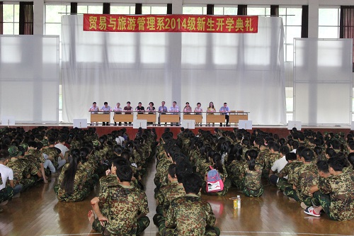 14日阳光明媚,早上9点,贸易与旅游管理系在校体育馆开展“贸易与旅游管理系2014级新生开学典礼”。