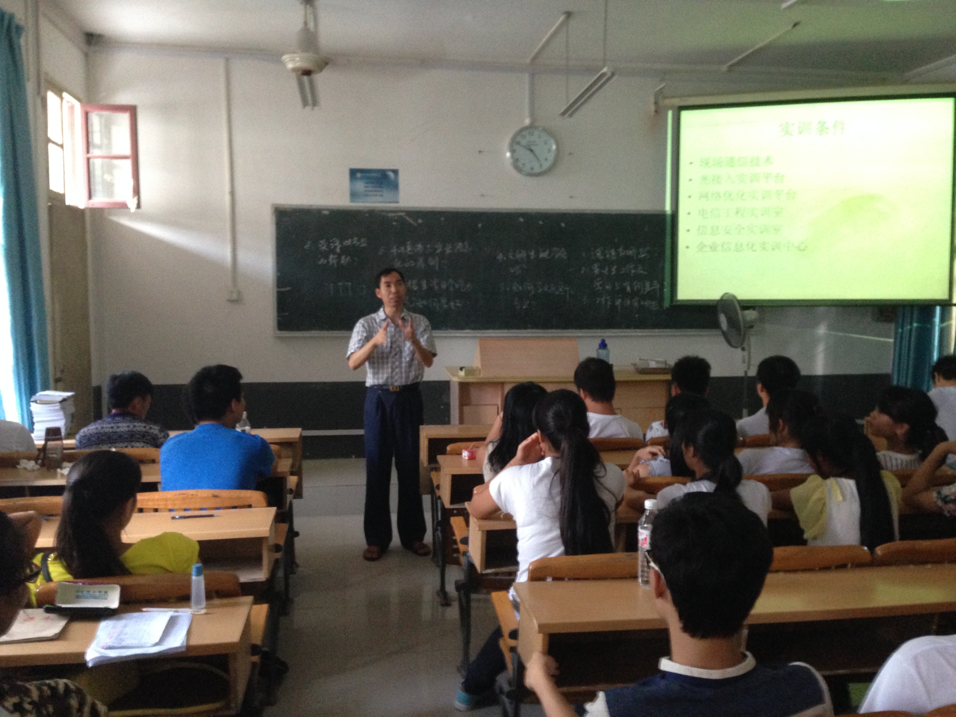 为了让2014级通信技术专业的新生了解通信发展现状,更全面地了解中兴通讯班的合作背景,明确人才培养目标,了解相关课程以及人才培养模式,9月15日,在竞择楼502-1专业实训室和文华楼103教室,中兴通讯专业工程师李俊杰和通信技术专业负责人莫徽忠老师为同学们做了相应的专业介绍。