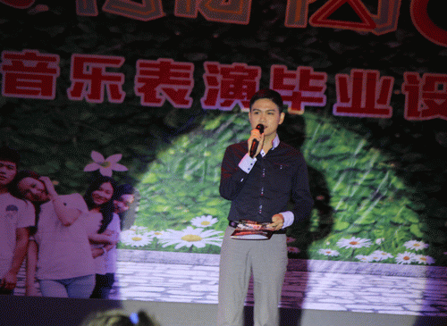 新闻网消息(通讯员 艺术设计系 刘滔 摄影 艺术设计系 廖玲珠) 2014年12月27日晚8点,我院艺术校区音乐表演厅在冬日的寒风中却是格外激情沸腾,在这里举行了艺术设计系第四届企业开放周毕业展演系列活动闭幕式——“我的青春高八度”2015届音乐表演班毕业设计歌舞晚会。学院党委书记朱伟才、教务与实训管理处处长韦林、招生就业处处长黄莉、督导室主任傅昌德、汽车工程系书记杨琳,以及艺术设计系书记梁毅、主任佘莉等系领导光临本次晚会。此外,晚会还邀请到山西省著名的表演艺术家雍和平老师、企业代表柳州市知音琴行、来宾市春花琴行董事长刘丽华。本次晚会由著名主持人、FM103.5桂中之声节目总监小熊老师担任主持,艺术设计系全体老师,各系学生代表共500余人参加了本次晚会。