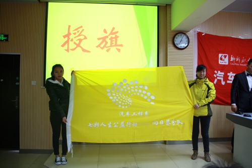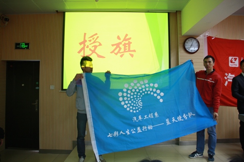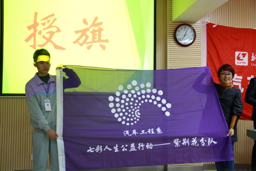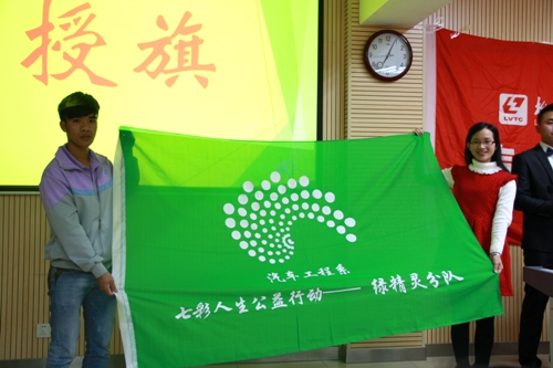 伍帅老师公布了本次中标班级,杨书记为各分项目一一授旗,各分项目中标班级和项目指导老师依次上台接旗。授旗仪式也标志着该系2015“七彩人生公益行动”主题活动年正式开始。