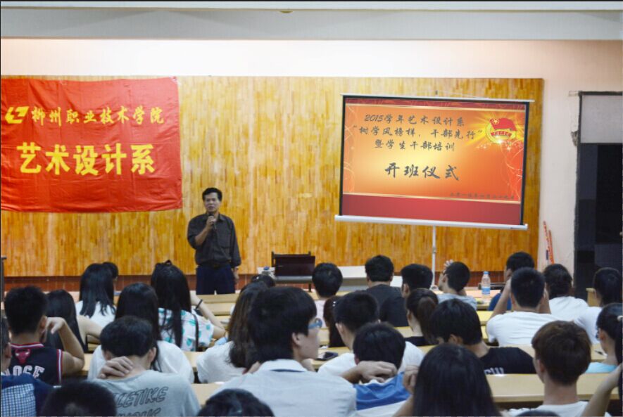 新闻网消息(通讯员 艺术设计系/黎小荣 图/黄成基) 为进一步提高学生干部素质,加强学风建设,4月30日晚,艺术设计系举行2015年“树学风榜样干部先行”学生干部培训班开班仪式。此次培训班将持续整个学期,从学生干部的自我认识、组织管理能力、团队合作能力等方面开展培训,以激发学生干部争做思想进步的榜样、遵守纪律的榜样和学习的榜样意识。