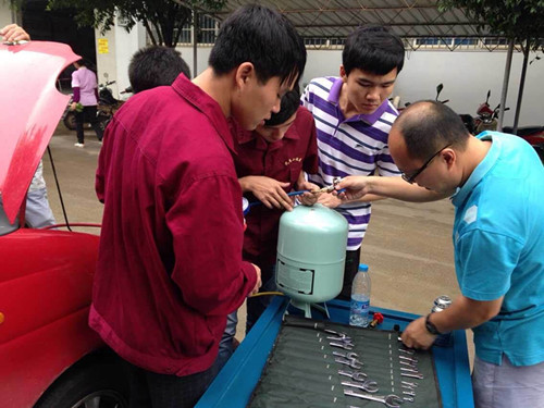 活动的发起源于《电气系统和能量/启动系统的诊断与维修》课程任课教师谭新曲老师,谭老师为了提高学生实践动手能力,将课堂直接对接实践活动,利用学习汽车空调的机会提议开展本次义务活动。义务检修的范围包括了七个汽车空调常见问题:1.空调不制冷,2.空调不够冷,3.空调只间歇有冷风吹出,4.吹风不能实现内外循环5.冬天没有热风,6.出风口没有风吹出,7.风机某些档位失灵。在活动开展过程中,谭老师认真细致地教,每个步骤都逐一指导,面对不同的问题也都明确指出解决方法,生动的课堂让学生在掌握汽车空调构造更容易了,提高了同学们对空调故障问题的检修能力,系统规范了排障的流程与要求,让学生真正做到了课堂与实践相结合。