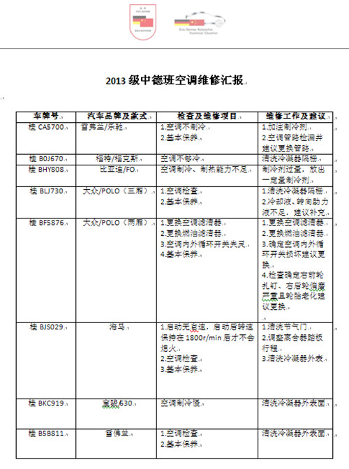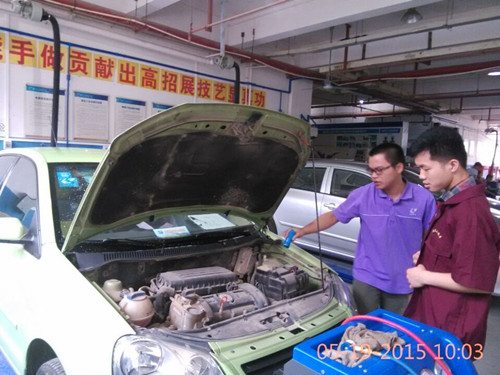 在活动开展的几天时间里,2013级中德班的同学们在谭老师的指导下,认真地为老师们服务,检测维修保养了8辆汽车,完成了包括清洗冷凝器外表面,加注制冷剂,基本保养等十多个项目。除了空调系统,同学们还给送检的车辆做了全面系统检测,对于检测出的问题及时与老师们沟通并且提出适当的维修方案,努力保质保量完成维修任务。活动的时间很短,但对于同学们来说却收获颇丰,真实的维修让大家技能得到锻炼,知识得到巩固,动手能力得到提升,而维修成功后的喜悦感也成为了同学们学习的动力。