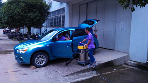 同学们用干湿两用清洁器对车内进行清洁