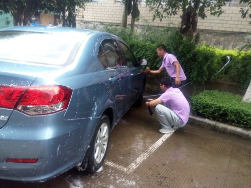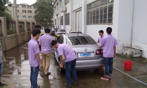 由于提前通过邮件和短信对此次活动进行了宣传,活动一开始就有不少车辆停在竞泽楼前等待清洗。活动现场,设有专门的接待台和简易的顾客休息区,活动分别设置了两个场地,可同时为四辆汽车清洁。本次活动负责人、14级中德班班长梁宽同学介绍,洗车标准严格参照汽车美容中心的程序来操作,洗车前先让车主填写车辆的相关信息,然后对车辆的车身外观、两油一液等情况进行检查,并及时记录下车辆的异常情况。洗车过程中,至少需要经过6道工序,首先,用清水将车身清洗一遍;第二,给车身上涂抹上洗车专用的洗车液,静置过几分钟后再用水冲洗干净;第三,用大毛巾把水擦干;第四,用小毛巾仔细地把边边角角残留的污垢擦干净;第五,吸尘和清洗车内的脚垫、坐椅;第六,擦拭车内的仪表盘、车窗玻璃等。洗车后,还让车主对车辆清洗情况和学生在洗车过程中的职业素养进行评价。
