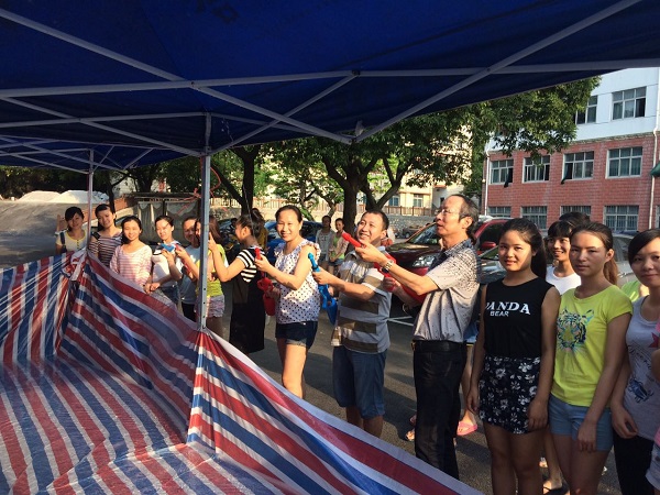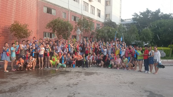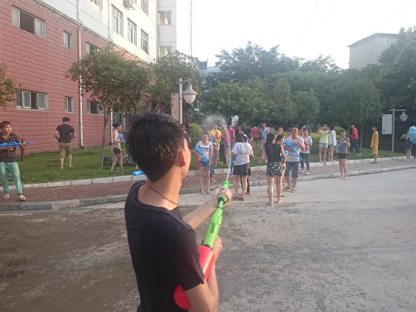 6月1日下午18时,贸旅系学生会组织120余名学生在达理楼旁开展“回忆童年,快乐你我”水仗活动。该系党支部书记牛永惠、学生科科长陈月明、分团委书记覃慧川、辅导员吴鹏为本次活动打响了“第一炮”。