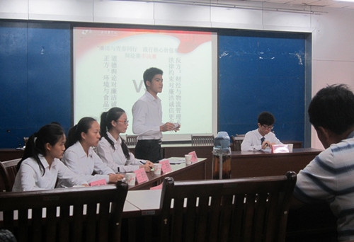 环境与食品工程系代表队作为辩论的正方,辩题是:道德舆论对廉洁诚信更有效;反方的辩题是:法律约束对廉洁诚信更有效。作为正方,一辩唐运岳同学开篇立论便明确阐述了观点,并辅以强大的理论和多个事实进行了论证;二辩周婷同学在对方立论之后,立即发现对方立论中的破绽,并进行了有力的驳辩;在质辩环节中,三辩徐宁同学利用多个社会现象为切入点,直截了当地向对方发起了“进攻”;在最为激烈的自由辩论环节中,双方辩手针尖对麦芒,围绕辩题进行了激烈的辩论,赢得了场下观众的阵阵掌声;最后,四辩张兰同学正本清源,在结辩环节中深入浅出,以团结、细致、严谨、沉稳的态度,结合辩论现状,机智全面的结辩,给在场评委和观众留下了深刻的印象。