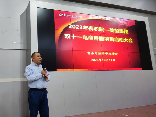 新闻网消息(文、图/贸易与旅游管理学院  韦璐青)为进一步推进2022级电子商务专业学生岗位实习工作的顺利开展,帮助学生了解实习工作的各项事宜,贸易与旅游管理学院于2023年10月11日在博闻楼110教室召开“2023年柳职院—美的集团双十一电商客服项目”启动大会。学院党总支书记陈月明、副院长杨歌谣、教务科科长秦熙治、学生科科长夏佩、电子商务专业团队负责人王冬云、专任教师、辅导员及美的集团企业方代表出席启动大会。本次会议由杨歌谣主持。
