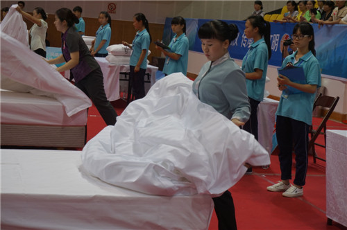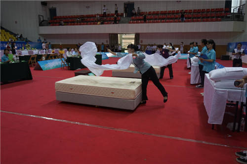 我院贸旅系酒店管理专业2013级酒店管理周秋桃同学代表柳州丽晶大酒店,参加2015年风情柳州旅游饭店服务技能大赛,荣获中式铺床三等奖。