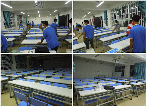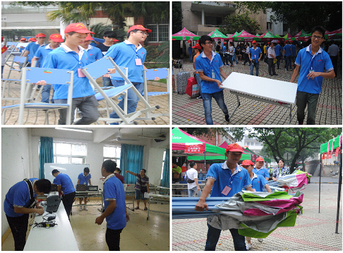 为了迎新工作能按时启动,减少新生等待的时间,志愿者们在迎新前一天就早早起来布置场地,搭帐篷、挂横幅、搬桌椅、摆物品,样样事情做起来得心应手,快速到位。在迎新当天早上天还未亮,志愿者们已经在迎新大本营开始清扫、整理工作,开始一天迎新的准备工作了。