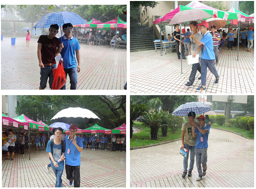 不论是艳阳高照还是刮风下雨,总有一番呼唤:“小红帽,有新生来了!”于是“小红帽”们迅速就位——“请问学弟是哪个专业的呀?”“我带你去打印报到表吧!”“我帮你扛行李吧!”“我来带你上宿舍吧!”“你在学校有什么事都可以找我!”外加对校园的解说,对柳职生活的各种风趣介绍,无不让新生及家长们感受到他们的细致入微、关怀备至。而今年的迎新,与一场倾盆的暴雨带来的冷风相比,志愿者们的行动则是一股沁入我们心脾的暖流。在大雨中,他们依然手撑雨伞,双脚踏入积水中,把刚刚下车进入校门的新生们迎入了系部的大本营中来。风雨再大也浇灭不了志愿者们满怀的热情和爱心。