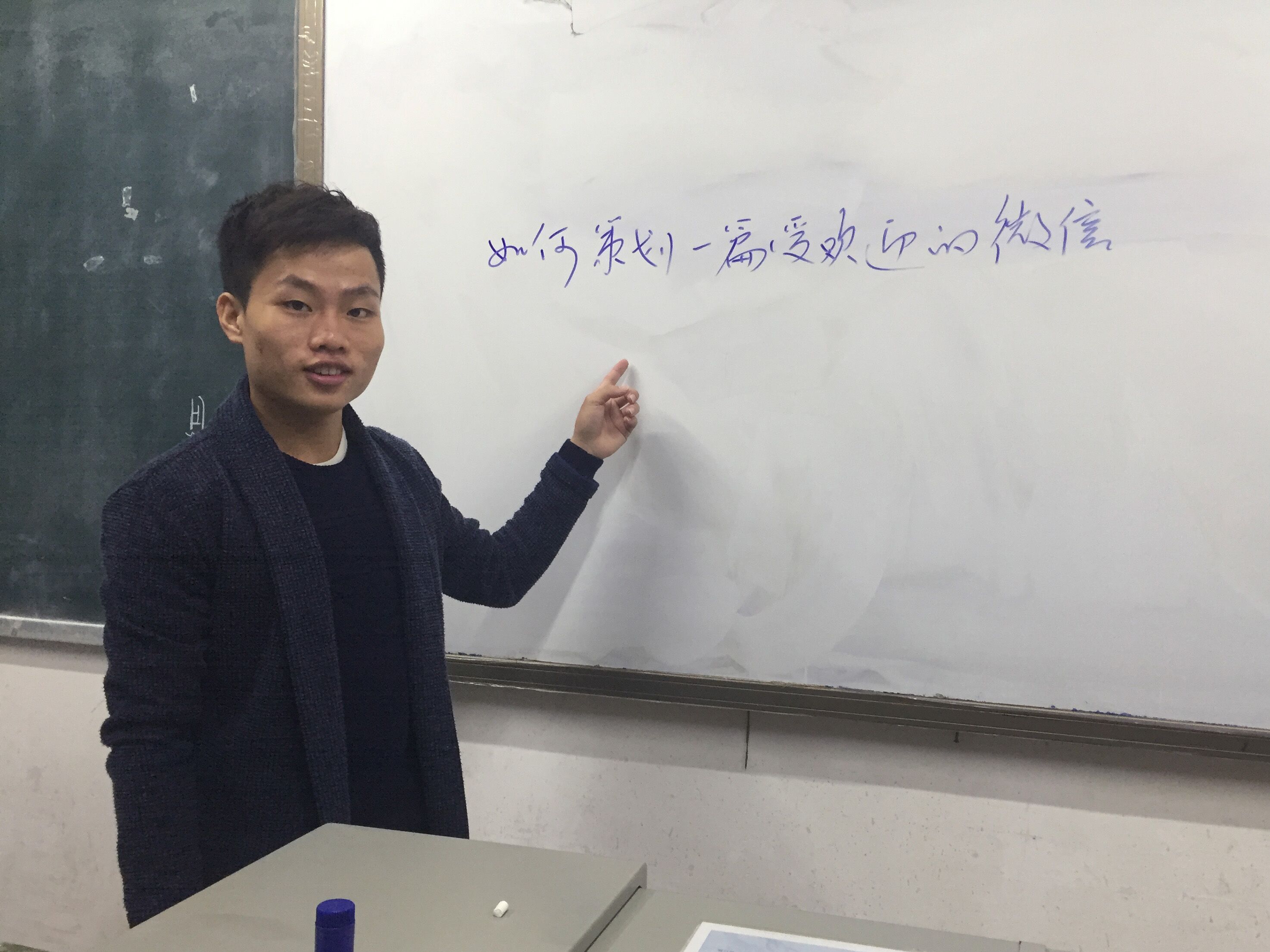 来自大三的学长彭明润给同学们分享了他在新媒体工作室担任站长的经验。以《如果我在柳职遇到你》这篇突破四千点击率、转发+收藏量最高的文章为案例,讲述如何打造一篇受欢迎的微信。从内容策划、文字、排版、篇幅等方面,分析这篇文章点击率、转发率高的原因,关键在于在内容上注入了“积蓄高唤醒度的情感、圈层标识、社交货币”。比如,把消费者想象成昏昏欲睡的人,微信要注入什么“情感强心针”才能唤醒他们的情绪?——高唤醒度的!比如敬畏感、娱乐感、愤怒、生气等情绪。