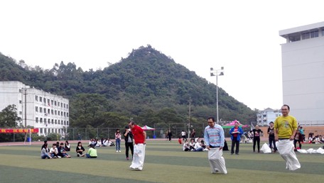 当裁判员的哨声响起,4位老师一同跃出了起点,你追我赶。比赛分男职工组和女职工组,有的男老师强壮一点,跳跃的步子非常大,围观的老师不由得连连惊叫;女老师也不甘示弱,虽然步子没有男老师跨得大,但是女老师们跳跃的频率普遍较高。有的老师一只手拿着袋子,另一只手像雄鹰的翅膀一样张开,眼神坚定的望着终点,每一步跳跃都憋着一口气,当落地的那一刻马上以迅雷不及掩耳之势换气再起跳,如此循环。老师们跳过终点的那一刻在场的观众都发出了欢呼声,尽管运动员们很累但是还不忘了和队友来一个胜利的击掌!