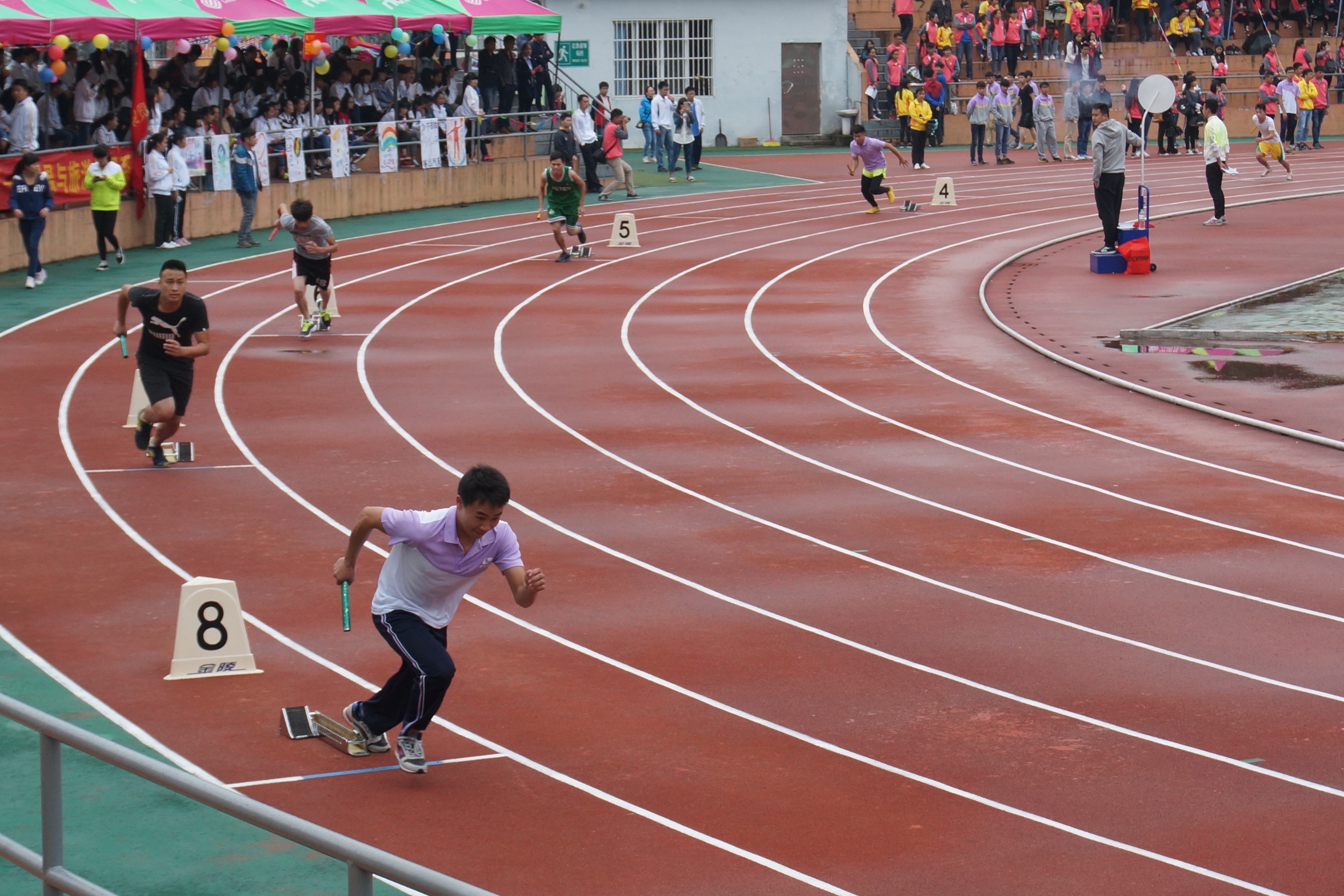 接力赛不但可以激发运动员的爆发力,还能培养运动员的团队意识和团结协作的精神,所以该项运动一直是校运会的重头戏。本次校运会接力赛有男子组4×100米、女子组4×100米以及男子组4×400米、女子组4×400米四项。