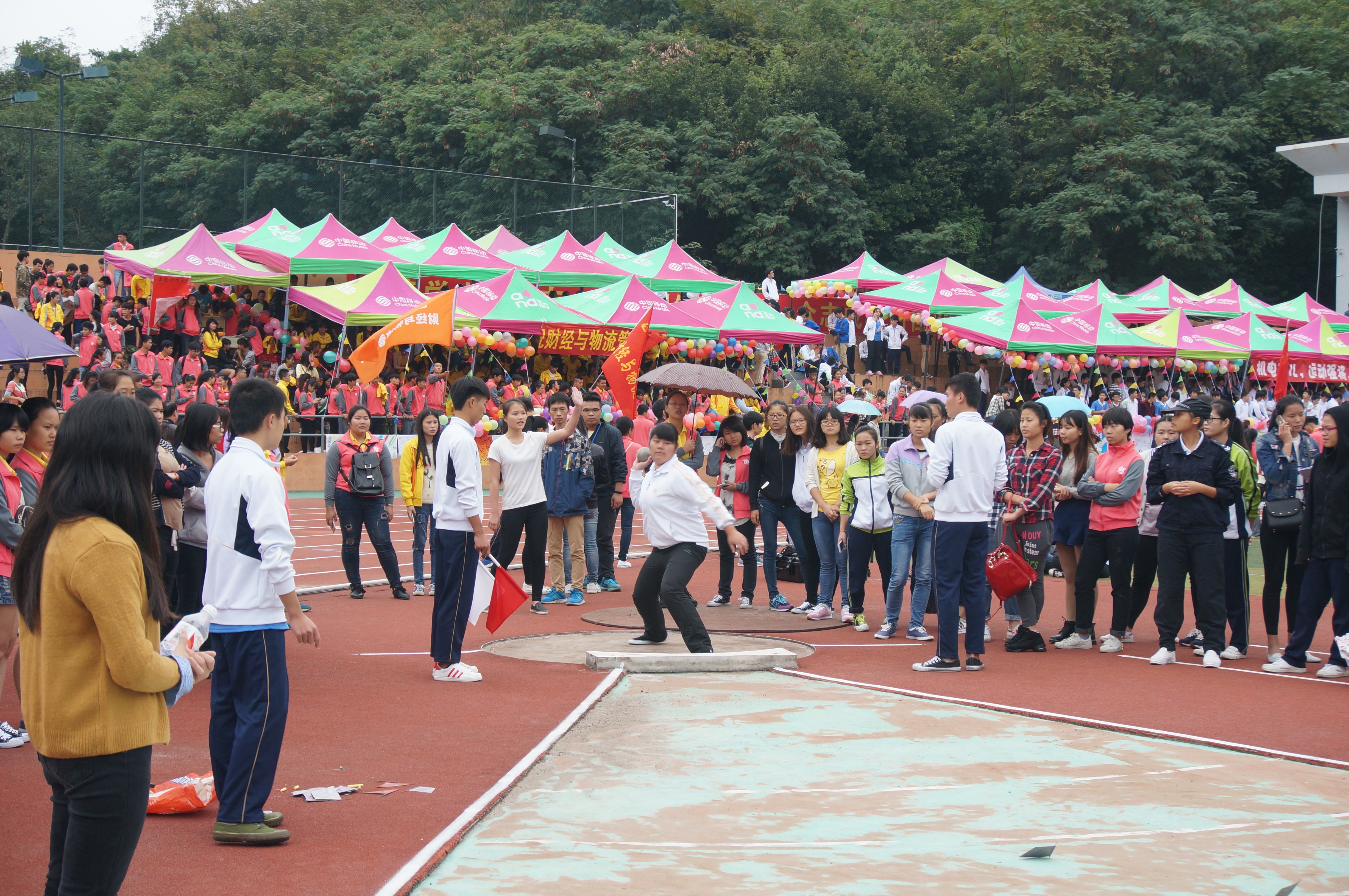 本次运动会铅球项目女子铅球重量为4kg,非??佳樵硕钡奶辶捅⒘Α?kg对于她们来说并不是个太大的挑战。甫一开赛,场上的呐喊和加油鼓劲声就从未间断过,强大的“后援团”无时不刻在鼓舞着运动员奋力拼搏。运动员们举起手中的铅球向远处抛出一条条完美的抛物线,落点一次比一次远。经过几轮艰苦卓绝的大比拼,15酒店2班的谭语诗同学以8米26的好成绩成功捧走该赛项冠军。