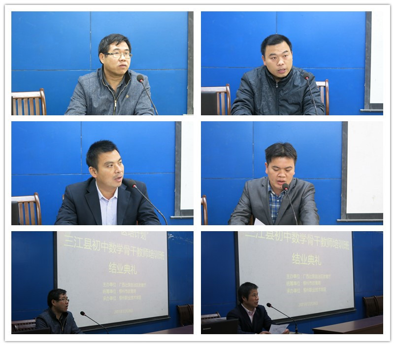 各组学员代表分别上台介绍了十天培训的学习收获和心得体会,学员们普遍感到本期培训内容实、收获大,无论是讲座报告还是跟岗实践,都让人耳目一新,讲座内容充实、实践性强,具有很强的指导意义。跟岗实践中,与柳州市各中学教师的学习交流也收获很多,解决了不少老师一直困扰多年的难题,为进一步提高中学数学教学工作提供了很多可资借鉴的模式和方法,同时,学员们对学院及工作人员提供的细致入微的培训服务表示衷心感谢。