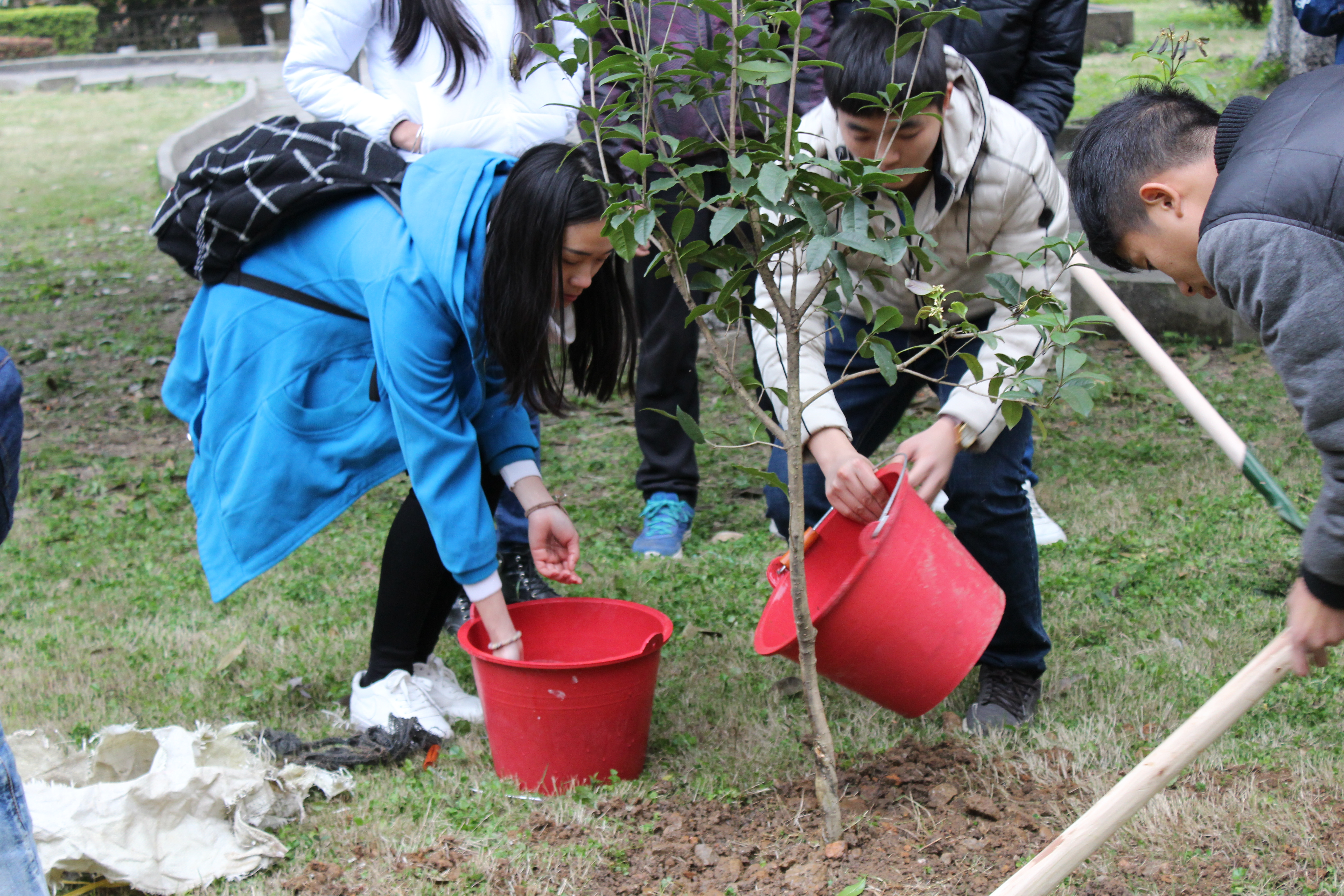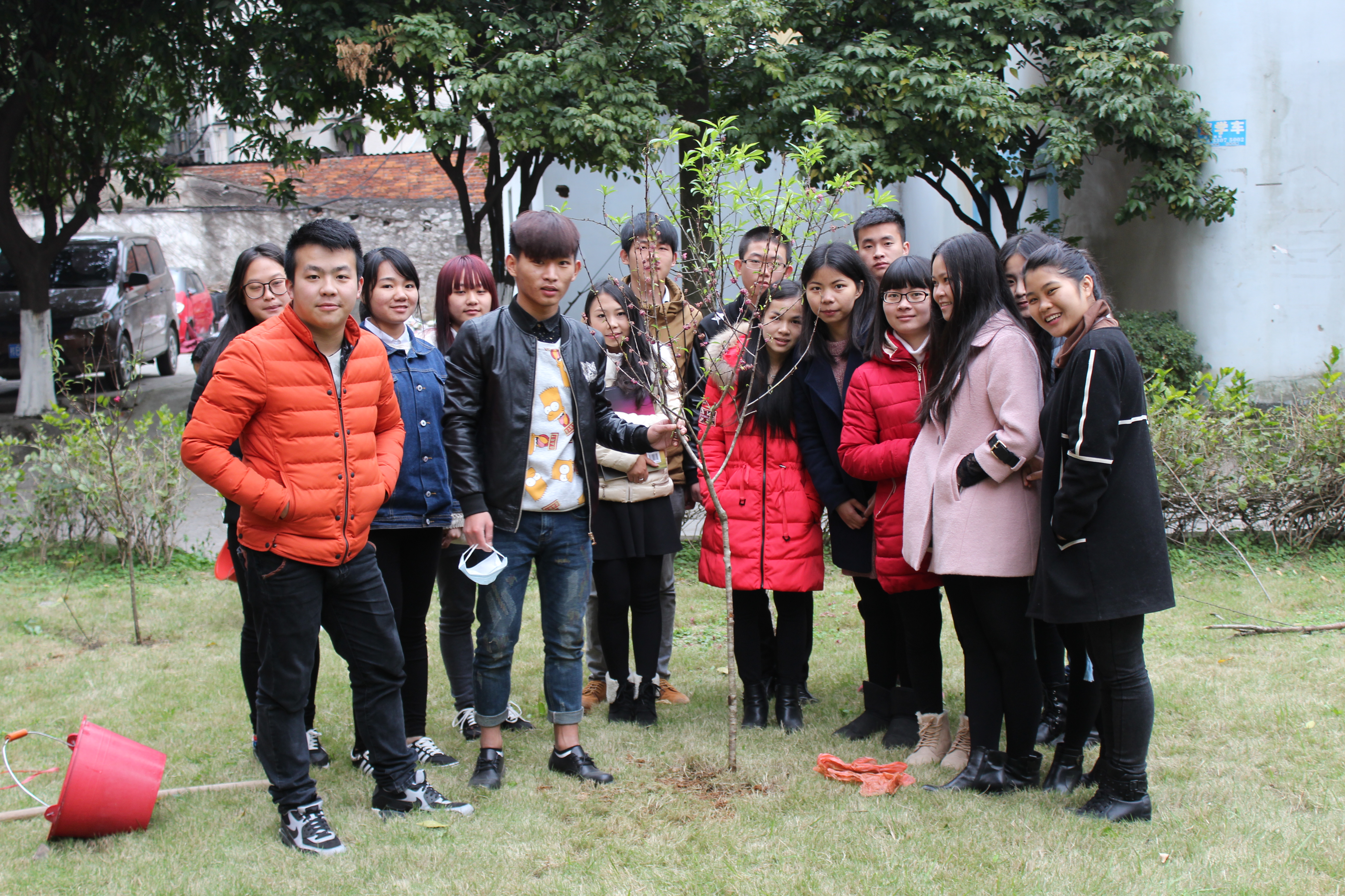 森林既是大自然的空调机,又是大自然的加湿器,植树造林不仅能够美化环境,提高空气质量,还能改善气候的状况,可谓一举多得?;疃碧煜挛缥宓?,在该系团委学生会的组织下,2014、2015级各班同学在1栋和2栋教学楼之间的绿化带有序集合,在系部领导和老师的带动下,同学们团结一致,齐心协力,挥动铁锹、锄头,干劲冲天热情高涨。挖坑、扶苗、填土、浇水、施肥等各环节都一丝不苟。同学们虔诚地把手中的小树苗植入大地,同时也把绿色的希望埋入了热土。经过一个小时的劳动,14株小树苗顺利地安了家。同学们虽然一个个汗流浃背,但看到一棵棵新栽下的树苗迎风挺立、原本空空如也的草地装饰成清新的树园时,个个都露出了欢欣的微笑。