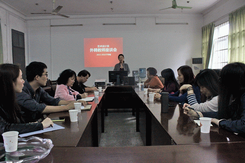 新闻网消息(通讯员/艺术设计系 黄芳)4月25日下午,艺术设计系2015-2016学年下学期外聘教师座谈会在艺术校区1栋203会议室召开,系主任佘莉、各专业教学团队负责人、教学秘书和来自四个教学团队的部分外聘教师参加,系教学副主任兼系党总支书记雍佳主持。