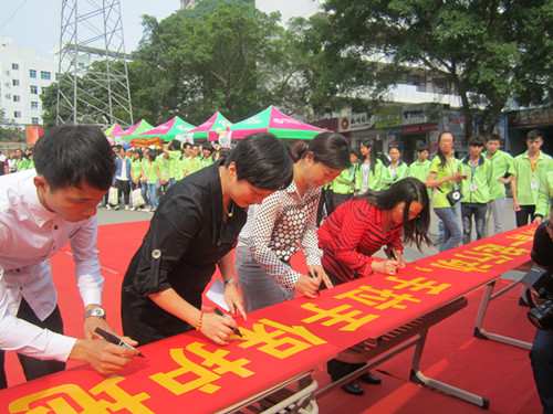参加活动的环保志愿者们签名支援环保