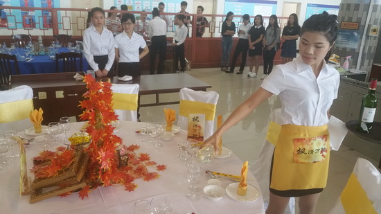 赛场气氛紧张而又热烈。参赛选手有条不紊、严格规范操作,展示了较高的水平,充分体现了酒店管理专业实训教学的优秀成果。此次比赛在赛项上推陈出新,比赛内容紧扣酒店管理专业的核心能力要求,突出强调学生综合职业能力的运用,全面考核参赛选手动手、动脑、动口的能力,展示参赛选手团队的协作能力、设计能力、创新能力和表达能力等职业素养。突出专业的核心技能,彰显了该系培养应用型人才的目标。15个台面设计作品创意新颖,展现了同学们高度的参与热情、熟练的酒店服务技巧和自主创新的能力,得到了在座嘉宾和评委的一致肯定。