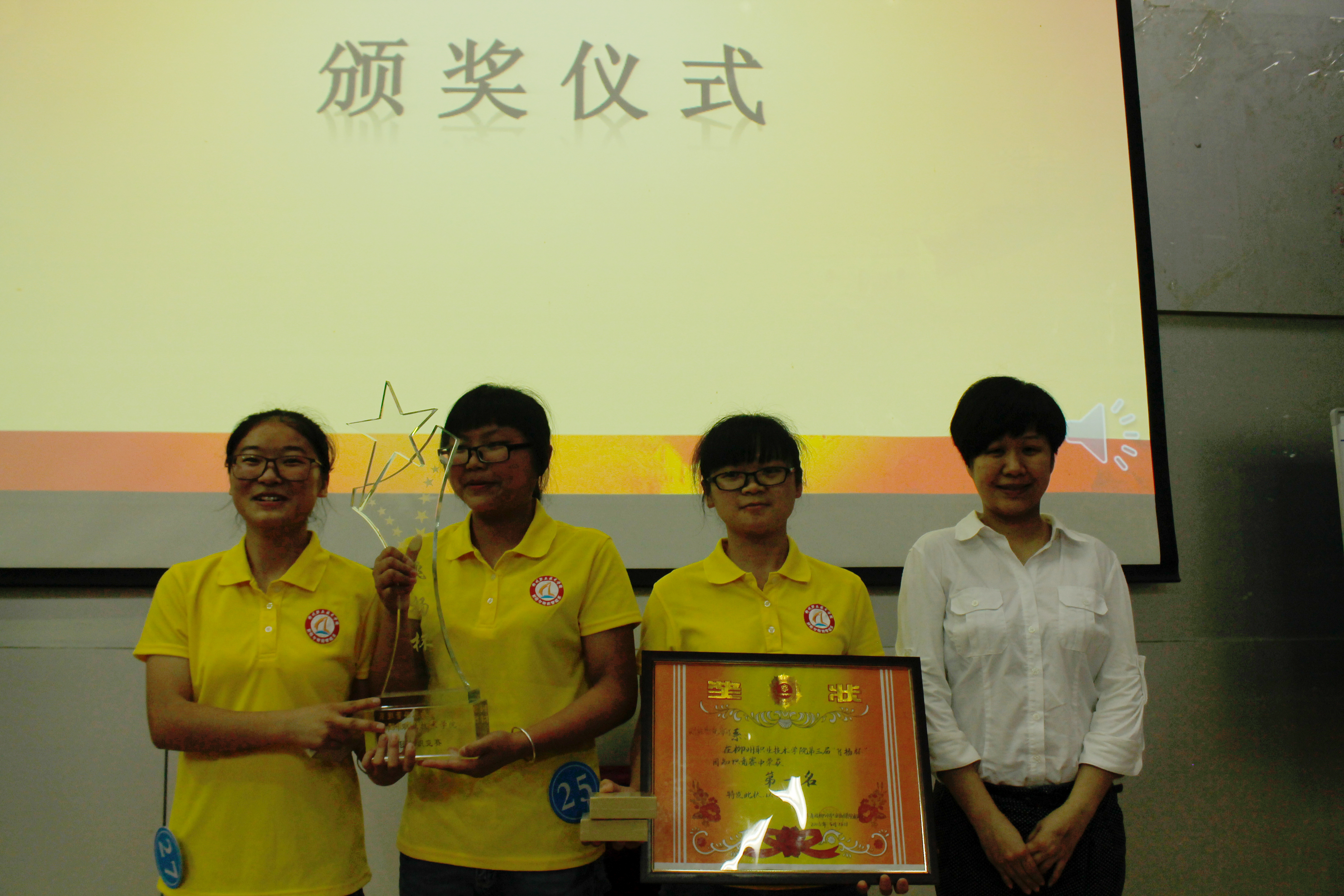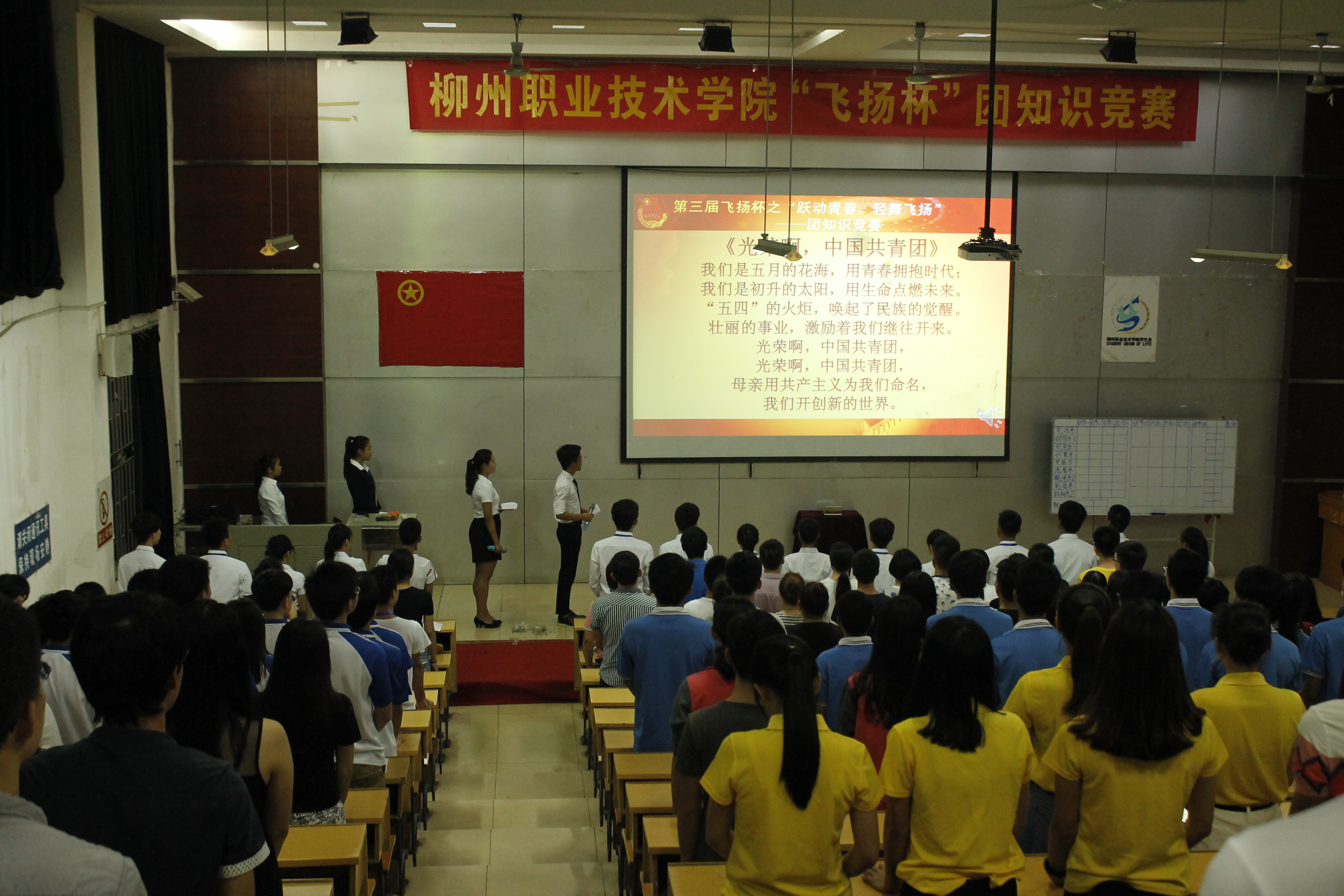 比赛以团知识竞猜、图片题、猜歌名、判断题等不同形式展示各类极具中国特色的改革开放、团组织建设、党团共建的的文化知识?;疃?,由上一届冠军财经与物流管理系献上“飞扬杯”奖杯,全体参赛人员起立合唱中国共青团歌——《五月的花?!罚醋云叽笙挡康?支学生队伍进入紧张、激动的比赛环节。