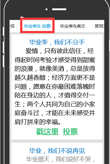 一是“毕业季微话题”:登录易班个人账号,发布话题,编辑内容完成后,在选择??檠±钢醒≡癖弦导灸??,发布范围是公开至机构号并点击选中柳州职业技术学院?;疤庥小?我的青春不散场——柳职,我的家!我有话对您说”和“梦想起航!学长学姐,请接受我们最诚挚的祝福 ”等两个主题。