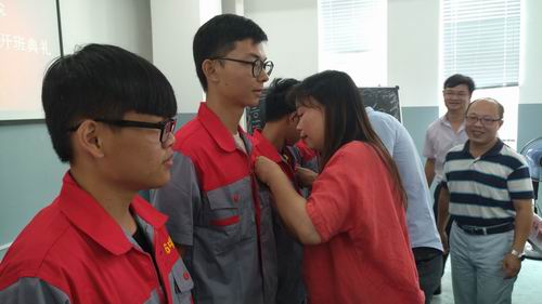 学院领导和专业老师们为2016级中德班所有同学佩戴上象征着荣誉和骄傲的名牌。从此,“SGAVE”的字样与这30名同学的姓名紧密联系在一起。这不仅是荣誉,更承载着责任和期盼。