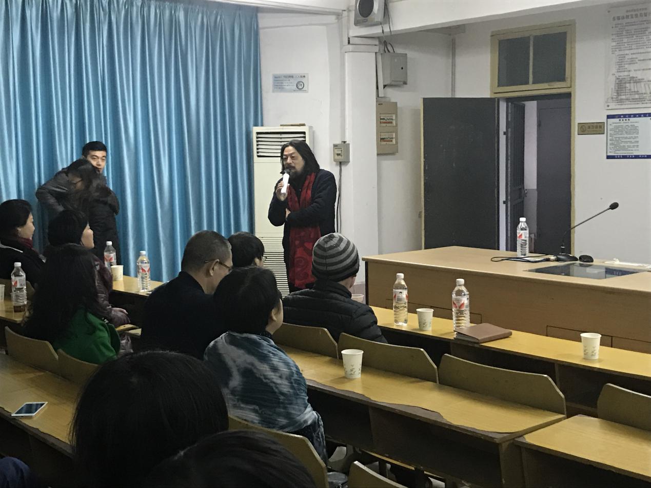 新闻网消息(文/艺术设计学院 孙艺心 图/艺术设计学院 郭闯)为促进学院学术交流和发展,拓展广大师生学术研究的视野,为学院营造良好的学术氛围,2016年12月29日下午,由柳州职业技术学院、大河湾美术馆、柳州石尚1966文化艺术园区联合主办,由艺术设计学院-视觉艺术设计团队承办的题为《独立品格》的艺术鉴赏巡讲,在我校艺术校区210教室举行。主讲专家分别有大河湾美术馆馆长禹至,桂林华星美术馆馆长、柳州初阳画院院长、广西师范大学客座教授胡京,职业艺术家陈光辉和世界汉字研究院副院长安东。柳州市文化艺术机构代表、广西科技大学教师代表,艺术家代表及学院相关专业老师和学生代表参加了巡讲课堂。讲座共分四个部分进行。