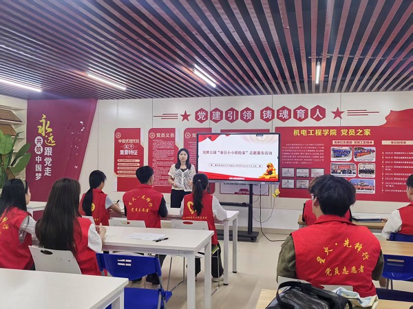 活动开始前,机电工程学院学生第一党支部书记兰丹媚组织志愿者们在D8思园党建工作站开展本次志愿服务活动动员会,告知工作内容及注意事项,并提醒大家在活动中注意安全。