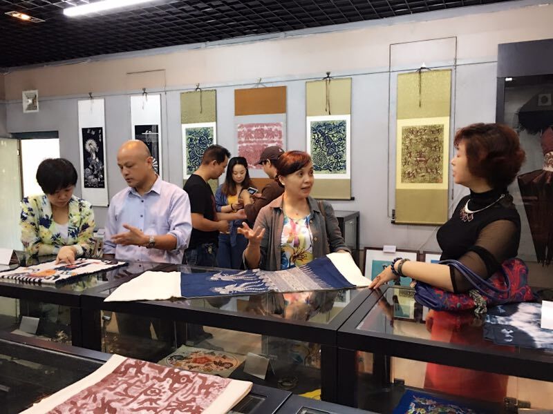 吴慧兰主任一行首先参观了马践老师的“广西民间工艺大师工作室”。马老师向来宾详细介绍了广西北部民间染缬艺术独特的民族风格,讲解了蜡染的创作元素、染料特色、选材和工艺流程,展示不同时期典型的作品特点。之后,还参观了染织服装艺术馆并座谈交流。谭竺雯副院长表示,民族的文化我们有责任做好传承和发扬,将民族的与世界的相结合,一定会让传统工艺散发出全新的魅力,也希望我们柳州的有少数民族文化资源的几所高校能够多交流、多合作,做出一些成绩来。