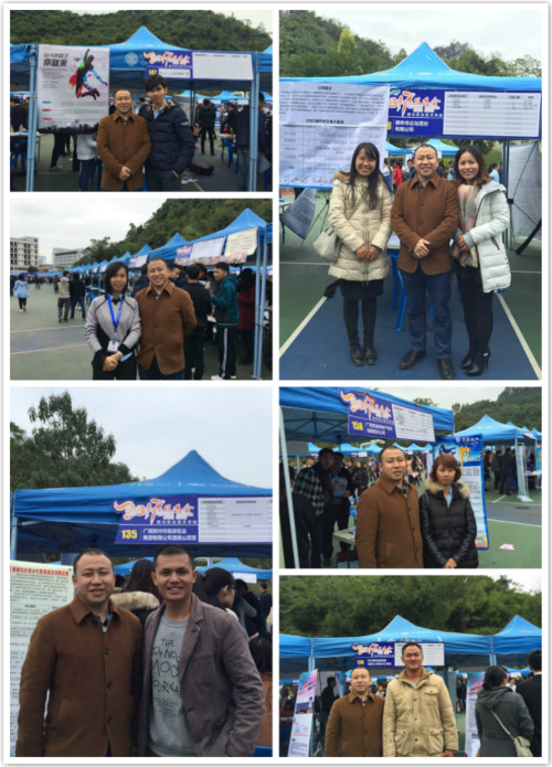 双选会当天,2006级物业管理的杨宏军、2012市场营销的王宏博、黄潇、黄丽颖、2013级电子商务的王永柠等校友,分别代表各自所在的广西贺州市旅游实业集团有限公司酒壶山宾馆、杭州娃哈哈集团有限公司柳州办事处、广西百度房产经纪有限责任公司、柳州市古坛酒业有限公司、杭州义淘网络科技有限公司前来我校双选会招聘师弟师妹。因为师兄师姐的魅力和亲近感,这些企业吸引了很多毕业生青睐、咨询。
