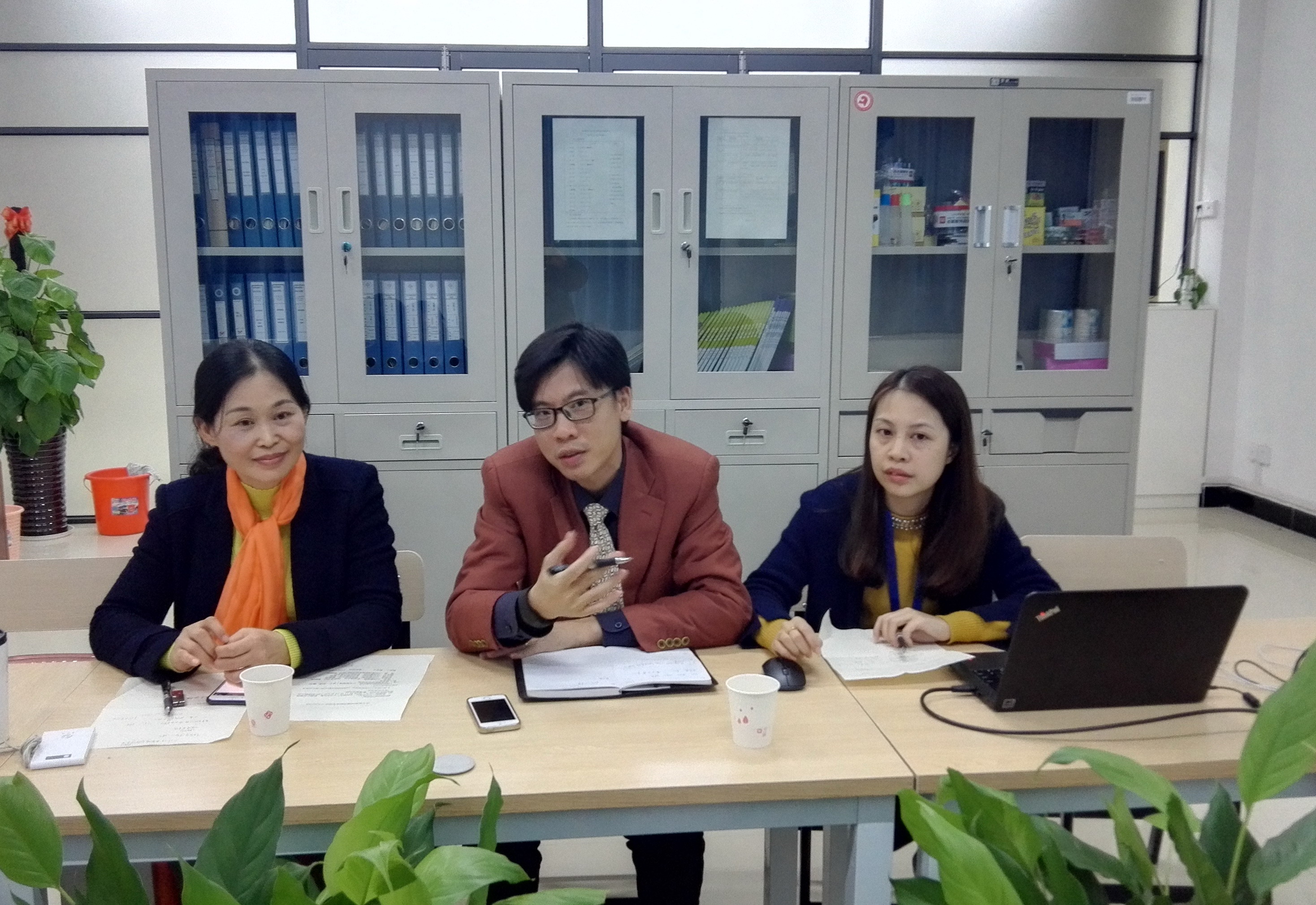 柳州城市职业学院公共教学部主任周华(中)介绍部门概况