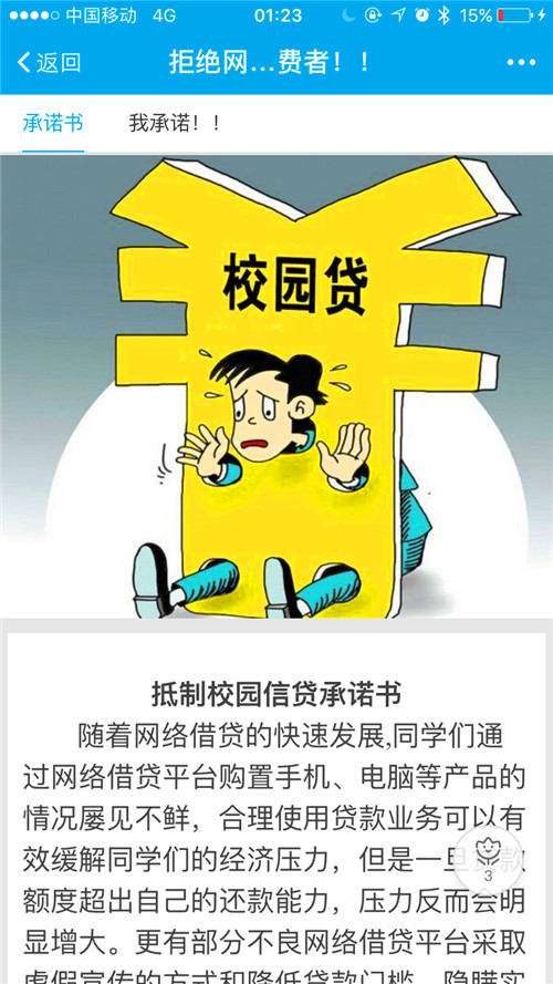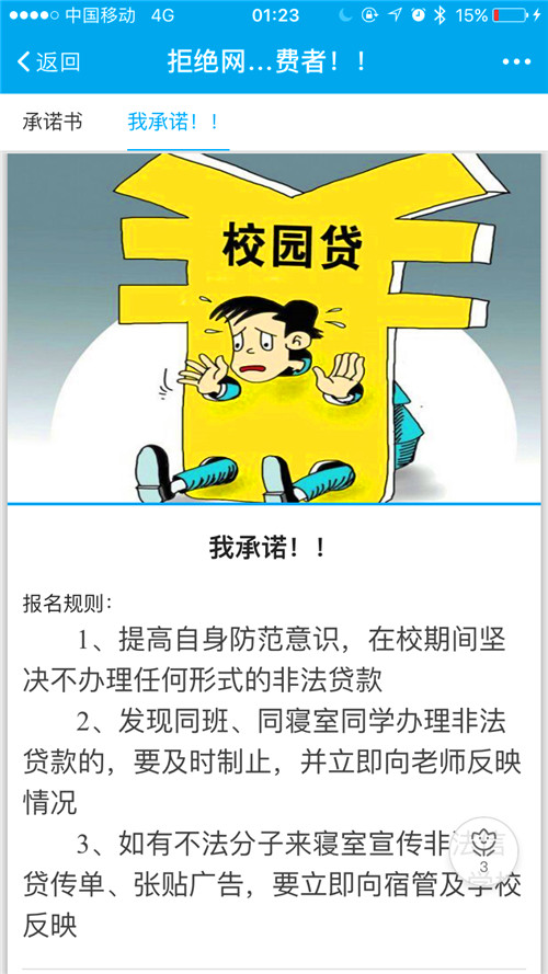 此次活动分线上互动跟线下活动同步进行,线上通过与易班、QQ空间等网络平台合作,开展为期一周的互动活动。在易班平台,同学们不仅可以看到承诺书,了解网络贷款的危害,还可以在承诺书下方完成线上承诺,在易班动态开展“拒绝网络贷款,做合理消费者”话题,邀请全校易班同学参加评论互动活动,线下在学院A区开展现场签订承诺书活动。该院志愿者现场讲解网络贷款的陷阱与危害,呼吁全体同学签订承诺书,共同抵制不良网络贷款的诱惑。