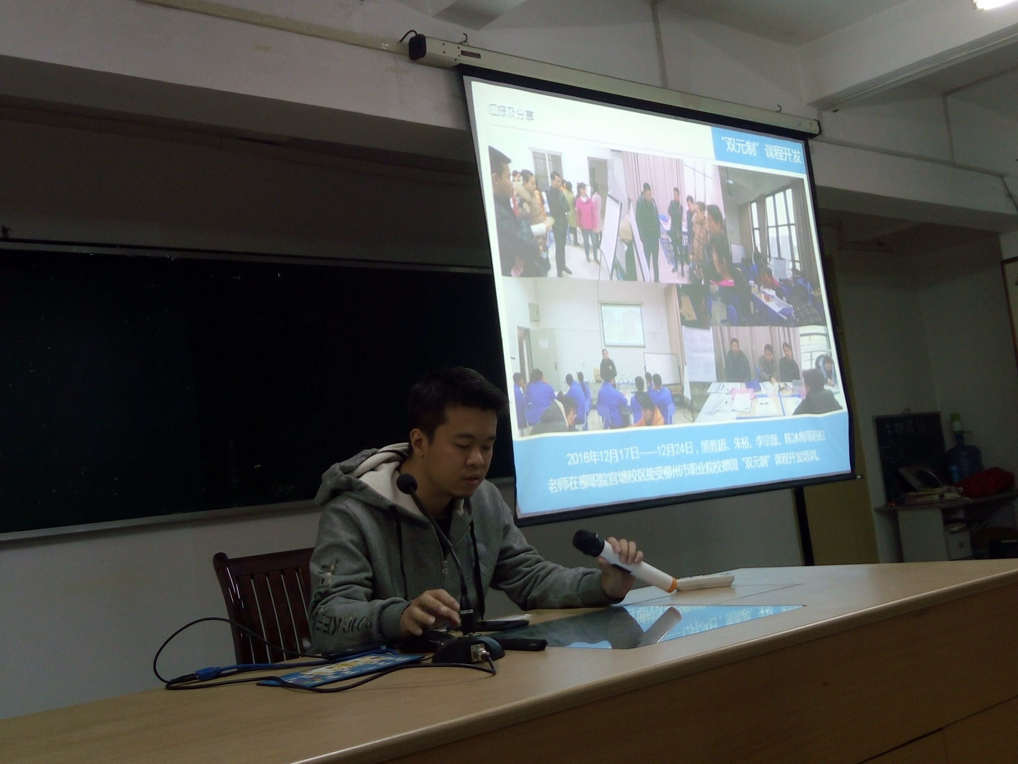 上学期外出学习培训的教师代表周皖萍和李宗晟分别作学习体会分享。周老师分享了参加2016年广西高校青年教师教学业务能力提升计划培训学习收获。在学习期间,专家和教授们的讲课使其受益匪浅,她特别认同广西师大黄麟生教授讲学中的一些观点和理念,从而引发了自己的一些思考,如黄教授强调的大学生 “三字”教育(即粉笔字、钢笔字和毛笔字)等;李老师参加2016年柳州市职业院校德国双元制课程开发培训班学习分享;郭闯老师做2016年《艺术设计考察》实训课程带学生外出考察时的总结汇报;梁异玲老师做微课作品《认识舞台空间的“九块方格式”》展示分享,该作品参加2016年第十六届广西高校教育教学软件应用大赛荣获总决赛一等奖及最佳艺术效果奖,梁老师主要从微课制作的技巧、参赛经验等方面进行了分享。