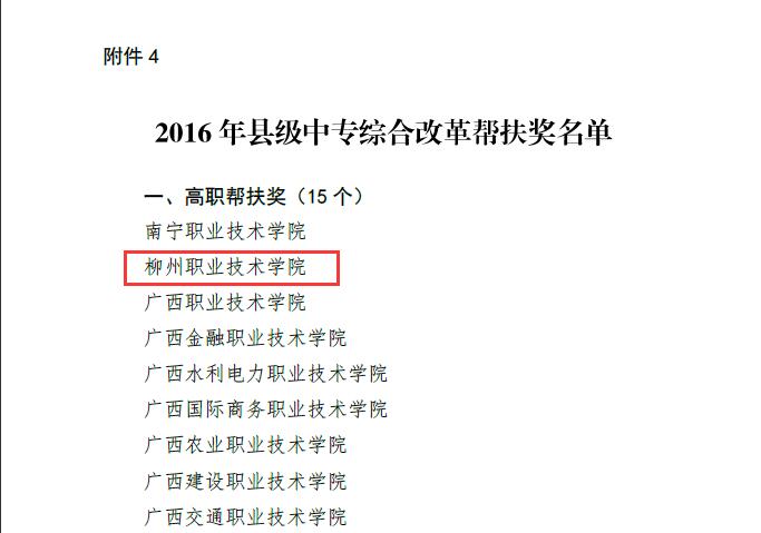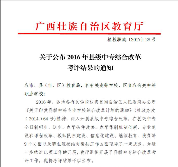 新闻网消息(通讯员/ 教务与实训管理处 刘晶)近日,自治区教育厅下发了《关于公布2016年县级中专综合改革考评结果的通知》(桂教职成〔2017〕28 号),我校开展的对口支援工作再次获奖,荣获2016年全区县级中专综合改革帮扶奖。在自治区教育厅开展的县级中专综合改革考评中,我校连续四年获得此项殊荣。