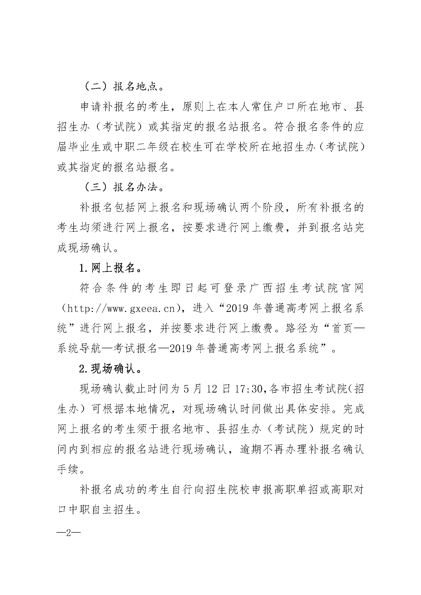 转发(桂招考委〔2019〕2号)关于做好我区2019年普通高等学校招生考试补报名工作的通知 来源: 发布时间:2019-05-08 18:43:00 浏览次数: 次 【字体:小 大】 正文公文,可使用电脑访问浏览或下载文件浏览(桂招考委〔2019〕2号)关于做好我区2019年普通高等学校招生考试补报名工作的通知.pdf 终审:招生信息中心 分享到: 【打印正文】