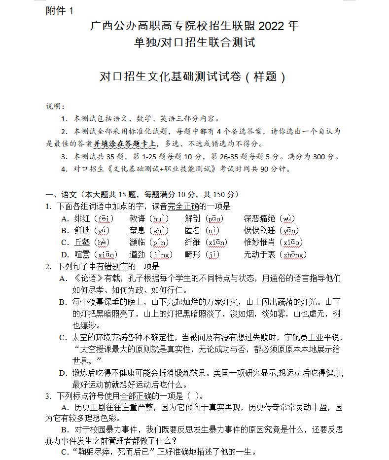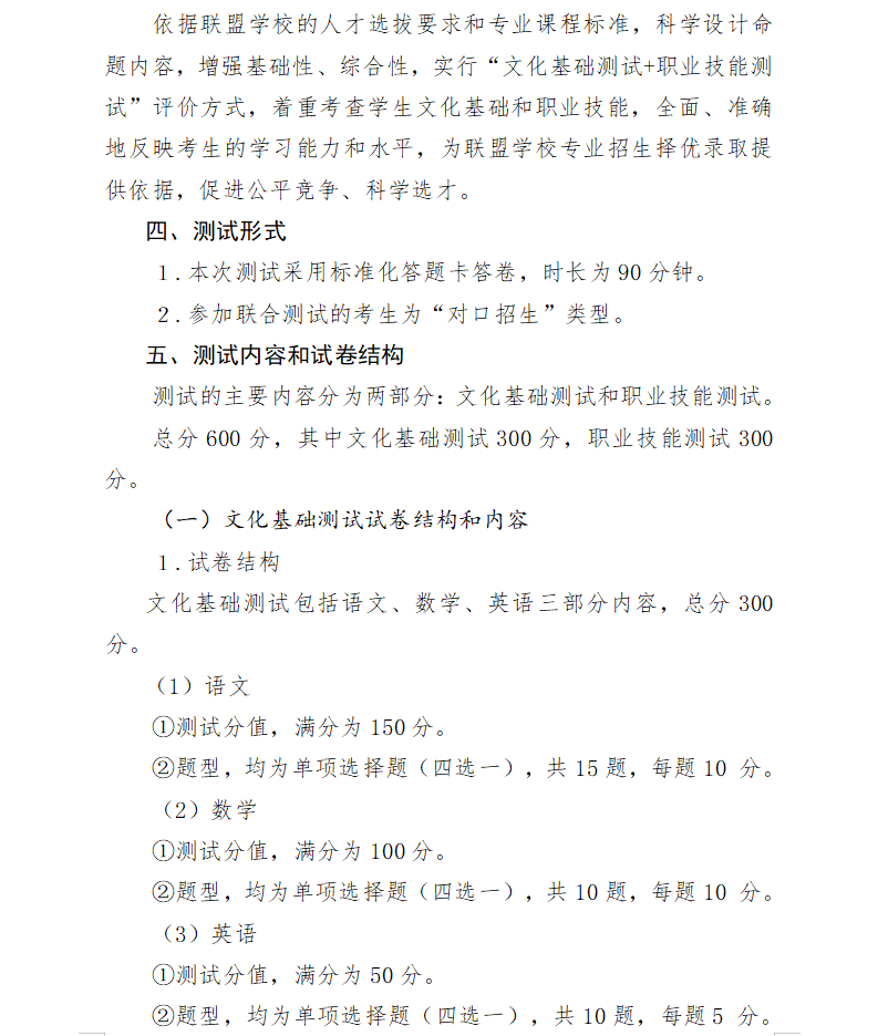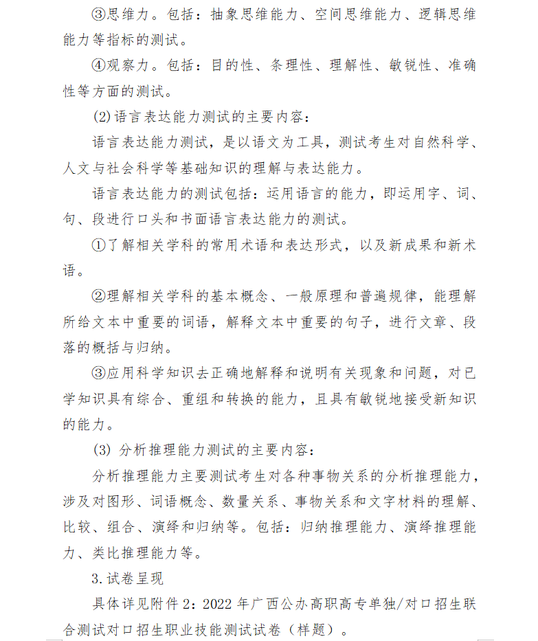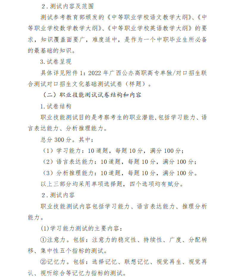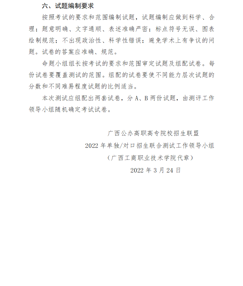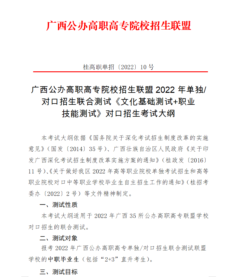 广西公办高职高专院校招生联盟2022年单独/对口招生联合测试《文化基础测试+职业技能测试》 对口招生考试大纲及样题 来源:广西公办高职高专院校招生联盟 发布时间:2022-03-26 10:07:24 浏览次数: 次 【字体:小 大】 终审:招生信息中心 分享到: 【打印正文】