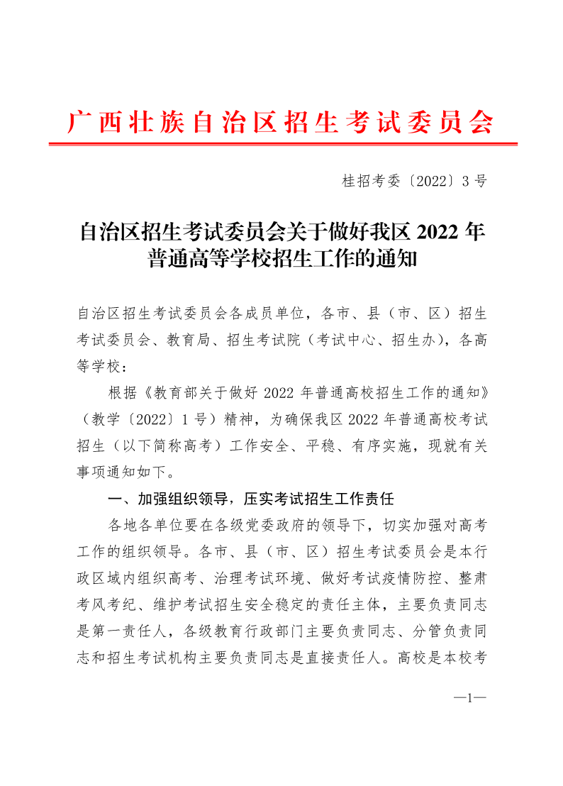 广西壮族自治区招生考试委员会关于做好我区2022年普通高等学校招生工作的通知
