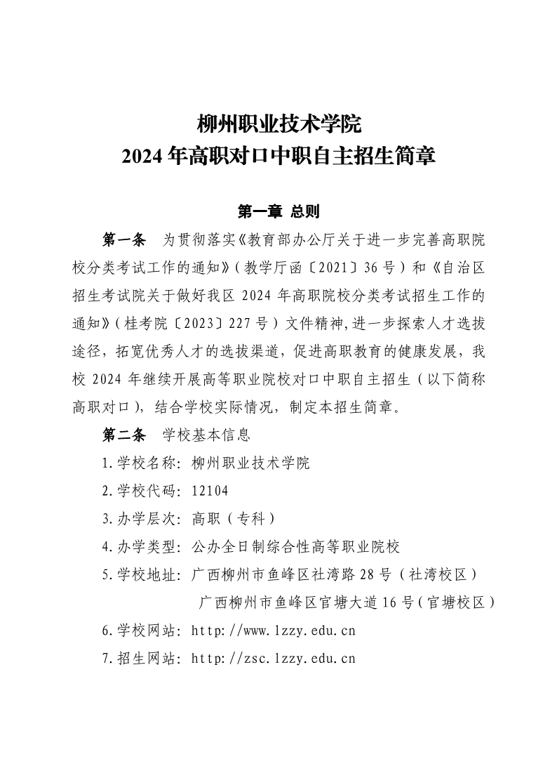 柳州职业技术学院2024年高职对口中职自主招生简章
