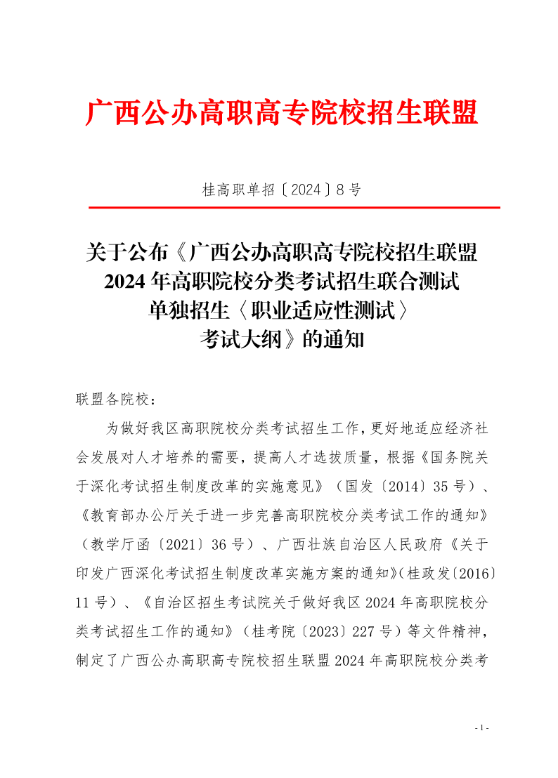 桂高职单招〔2024〕8号-关于公布《广西公办高职高专院校招生联盟2024年高职院校分类考试招生联合测试单独招生〈职业适应性测试〉考试大纲》的通知