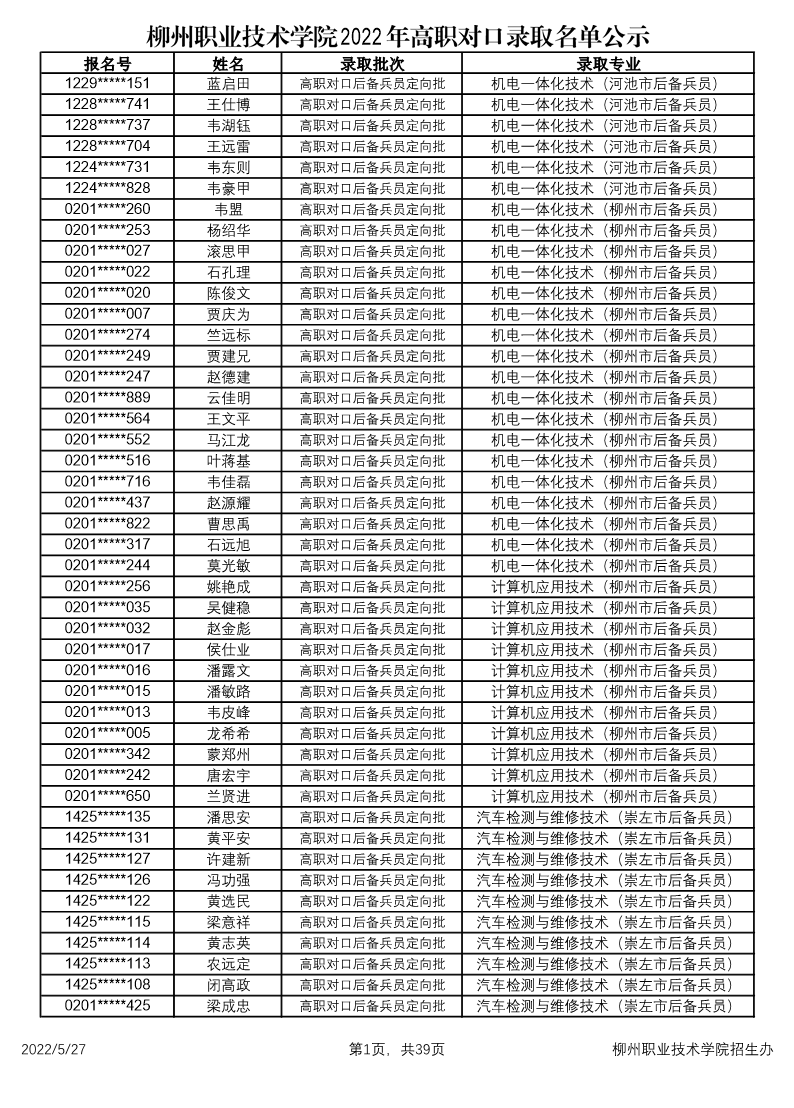根据《关于做好我区2022年高等职业院校单独考试招生和高等职业院校对口中等职业学校毕业生自主招生工作的通知》(桂招考委办〔2022〕2号)等文件要求,按照广西招生考试院统一安排,我校2022年高职对口第一阶段录取工作已结束,录取名单已通过广西招生考试院审核。按照我?!读葜耙导际跹г?022年招生章程》(柳职院字〔2022〕8 号)的规定,现对我校高职对口第一阶段录取名单予以公示(名单附后)。
