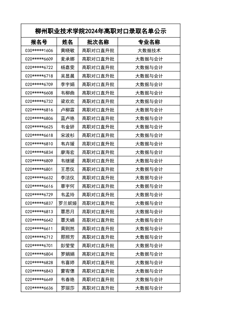 柳州职业技术学院2024年高职对口录取名单公示