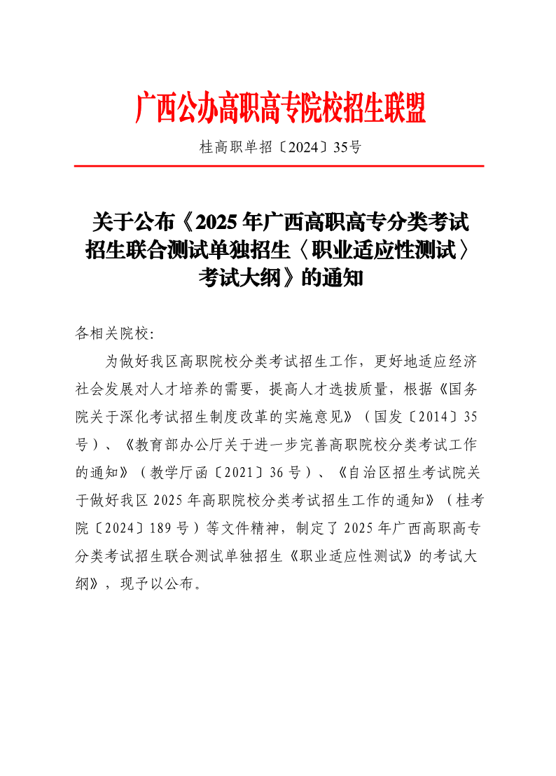 关于公布《2025年广西高职高专分类考试招生联合测试单独招生〈职业适应性测试〉考试大纲》的通知(含样题) 来源: 发布时间:2024-12-06 16:21:39 浏览次数: 次 【字体:小 大】 终审:招生信息中心 分享到: 【打印正文】