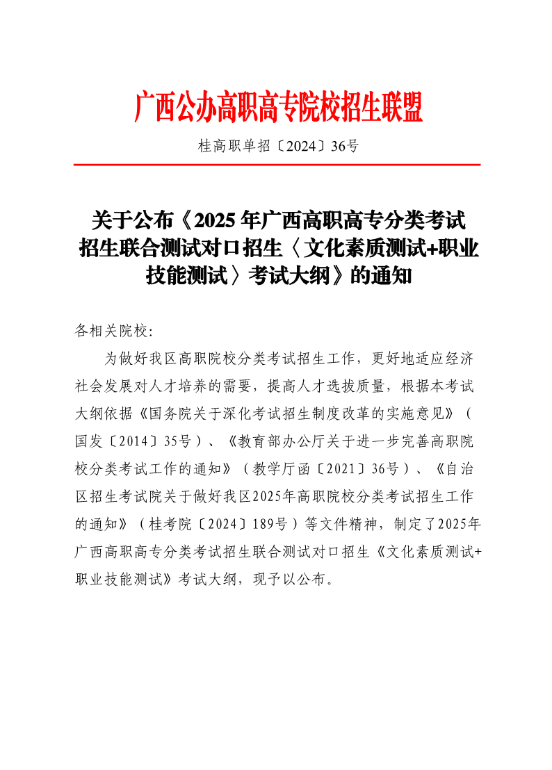 关于公布《2025年广西高职高专分类考试招生联合测试对口招生〈文化素质测试+职业技能测试〉考试大纲》的通知(含样题) 来源: 发布时间:2024-12-06 16:25:55 浏览次数: 次 【字体:小 大】 终审:招生信息中心 分享到: 【打印正文】