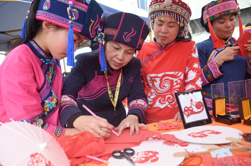 仫佬族剪纸技艺,是仫佬族妇女用白纸或红纸,裁剪麒麟、门神等吉祥图案,或“?!薄跋病钡燃槲淖?,作为家居装饰;或剪成模型用来纳鞋、刺绣、雕刻花窗等,是仫佬族人民历代传承的传统美术。图为“仫佬族剪纸技艺”代表性传承人罗华清现场创作廉洁作品。(廖光福/摄)。