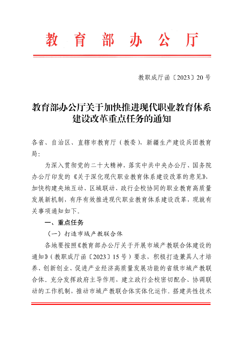 教育部办公厅关于加快推进现代职业教育体系建设改革重点任务的通知